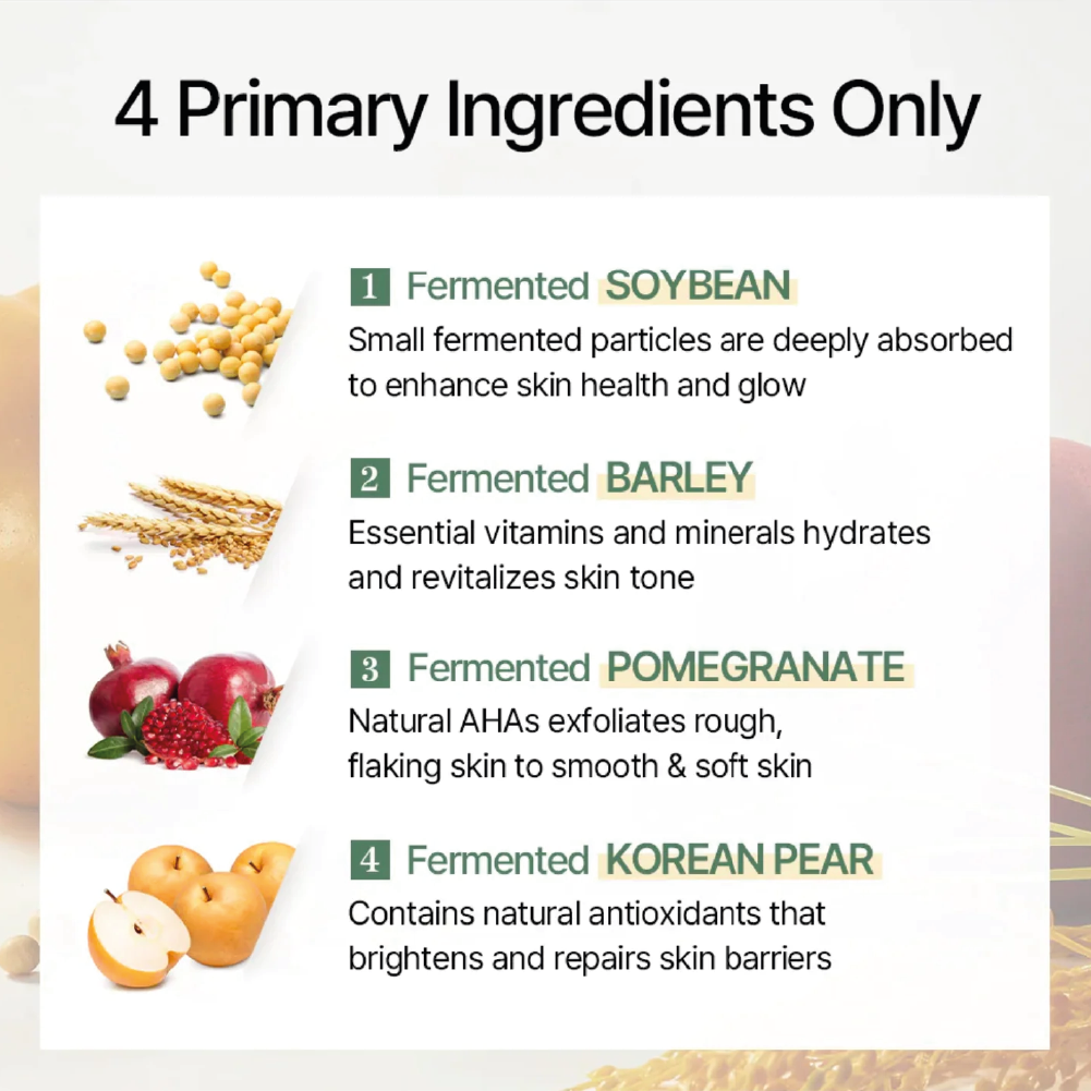 Esencia facial fermentada “2‑en‑1” que actúa tanto como hidratante suave como exfoliante muy ligero, gracias a una mezcla de ingredientes naturales fermentados: soja, cebada, granada y pera coreana .